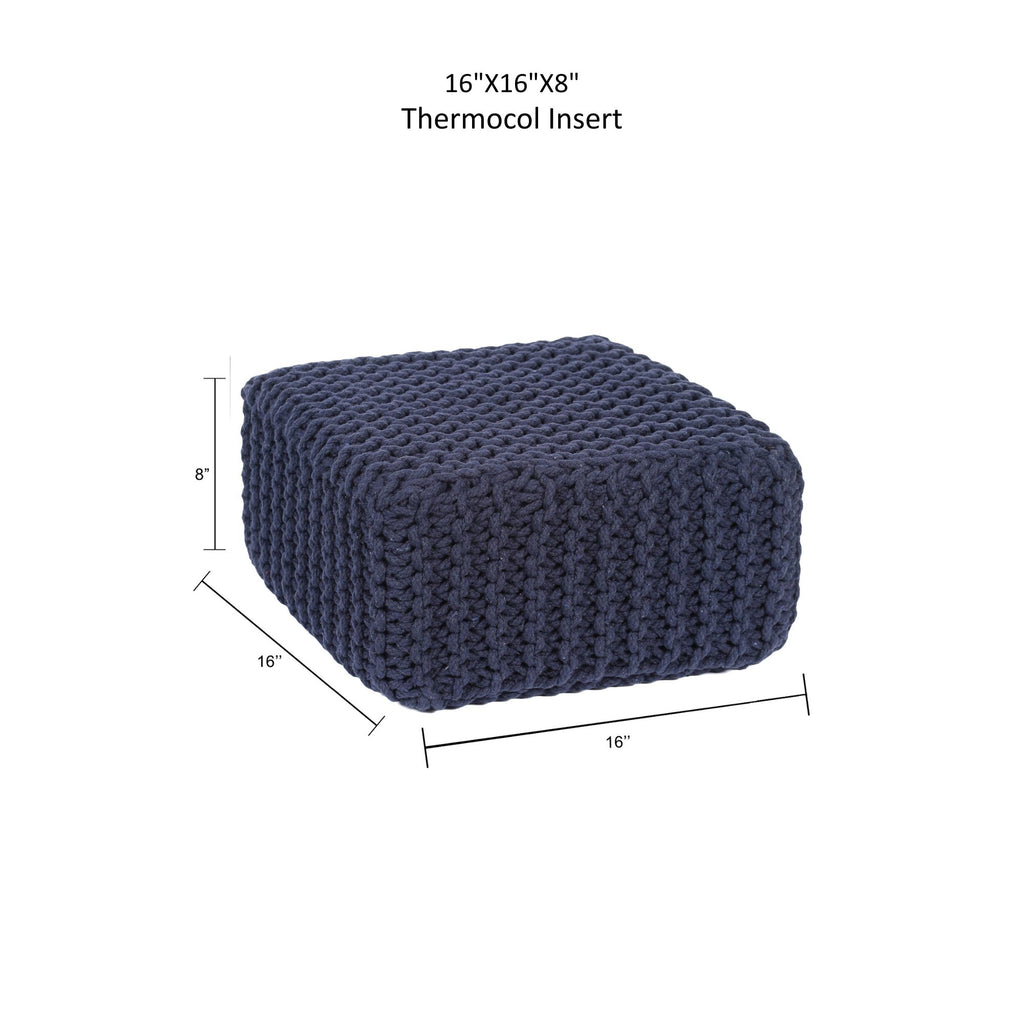 - HANDMADE FROM THE FINEST MATERIALS: The outer material on this eye-catching pouf ottoman is made from 100% cotton chord knitted in a unique pattern and filled with thermocol block inserts. Each floor pouf measures 16"x16"x8" inches and is handmade by our talented in-house artisans. This floor pouf is perfect when you need to rest your leg.